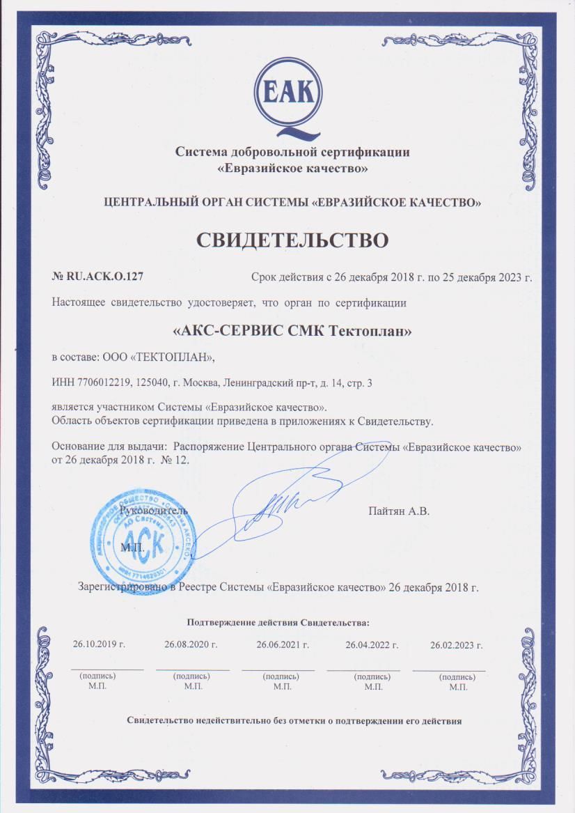 ООО «ТЕКТОПЛАН» аккредитовано в качестве органа по сертификации менеджмента качества в системе «Евразийское качество» и следует в своей работе положениям Стандарта деловой профессиональной этики.